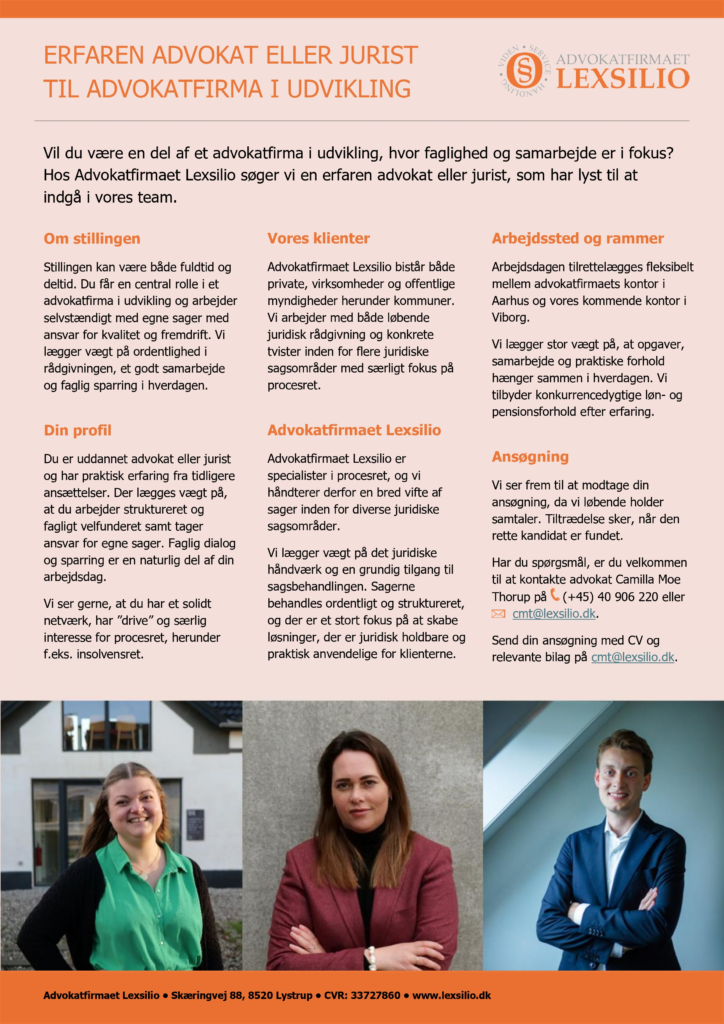 Vi søger lige nu en erfaren advokat eller jurist til vores advokatfirma, som er i spændende udvikling.